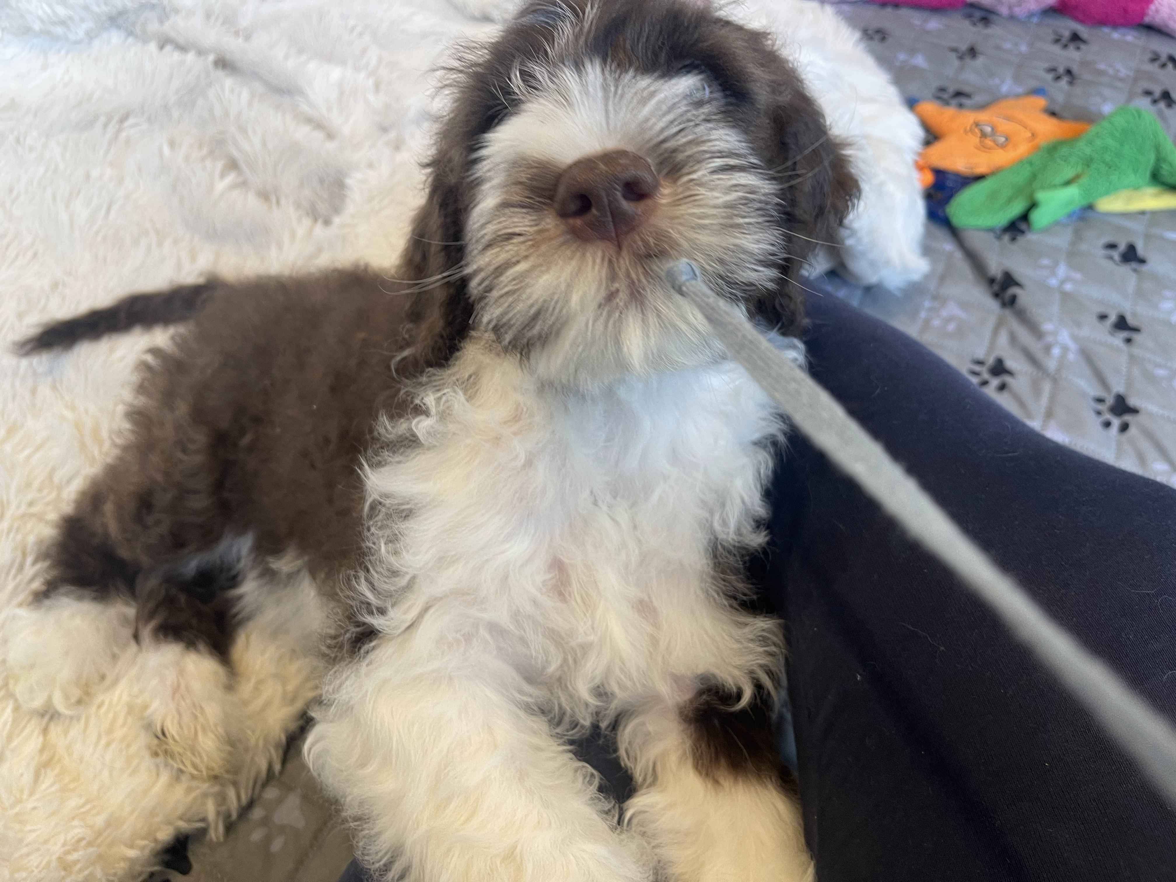 Puppy #6 who we affectionately call Birdie or Angel Wings is a gorgeous, playful pup. She loves to give kisses like her litter mates, loves grammas long hair to play with and responds quickly to my kissy sounds. Very social and may be a talker like her grand daddy when I listen to her coos and responses to me.