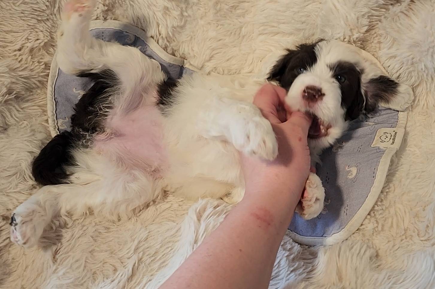 Number 11 here is a gem, I adore him. Sure, I adore them all, and I might be a little biased, BUT, he's a sweetheart. They're all learning the power of their little teeth still (puppies being puppies and all that jazz), but he's learning really well so far for his age! One of our larger pups (though that doesn't guarantee final size), he's going to be a really handsome little man, He has personality plus. He was always a bigger pup, but never bulldozed his way around food. Other pups have caught up in size, so he is average for his age, confident and a bundle of joy.